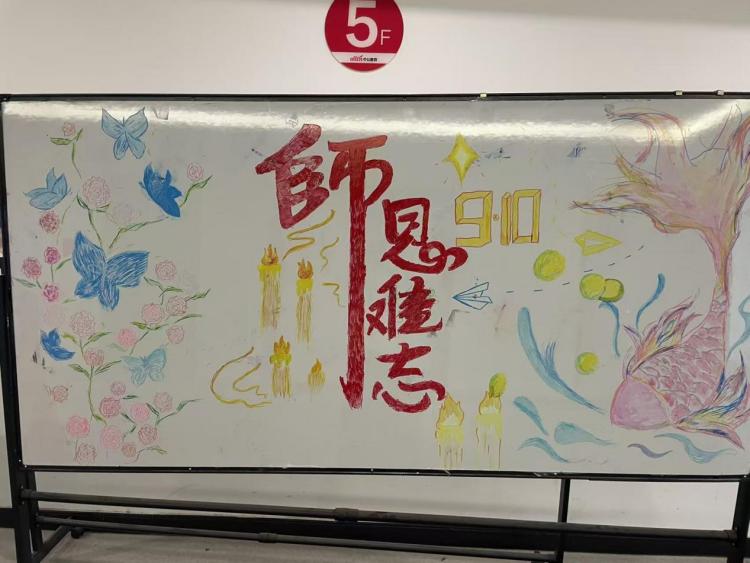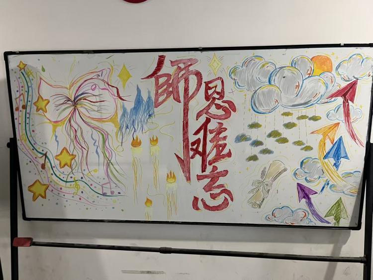 本次活动注重班级特色和师生情感联结,各教室成为了创意与感恩交汇的温暖空间。活动前夕,各班就已积极筹备,精心绘制了以“师恩难忘”为主题的黑板报。板报设计精美,图文并茂,既有对教师职业的崇高礼赞,也融入了各学科的独特元素和班级的共同记忆,成为教学楼里一道亮丽的感恩风景线。
